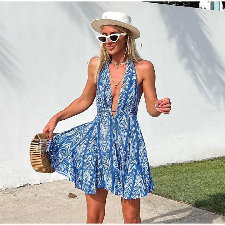 Step into summer with our sexy backless printed halter beach dress, designed for the confident woman who loves to stand out. This stunning dress is perfect for your summer getaways, effortlessly blending style and comfort for any beach or poolside occasion.
